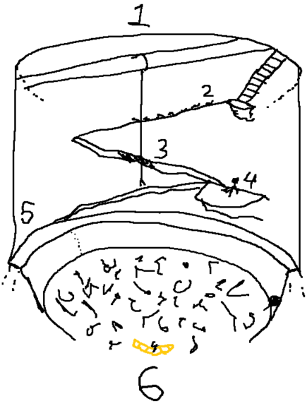 - The rope stops at a height just below area 4. It's frayed at the end, strands like antennae probing the dark below. - A deathly thin path snakes around the pit's edge, too tight to move without your back pressed to the wall. Small anthills stake their claim here, wedged into large cracks in the wall.