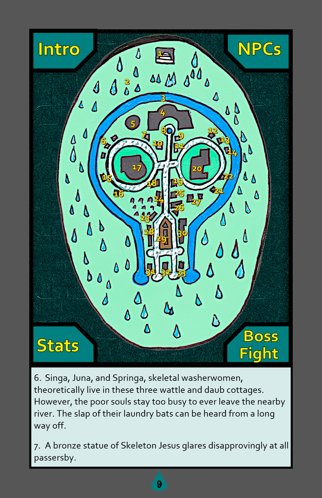Well vibes-wise it's exactly my shit but tbh on first read I wasn't sure how I'd run this. Mainly within all those keys only two (27 and 32) reasonably point to the exit in area 31; the rest is atmospheric skeleton scenery with little tension or movement. The town is 90% bone vignettes by volume. Per Evey's socials, in the Sisters of Moonlight setting you are forever moving through an endless number of heavenly dungeons (killer concept btw), so the goal is always to survive and find the exit. In that context, the sparse clues make more sense as this is more of an investigative adventure, but as written it feels directionless still.