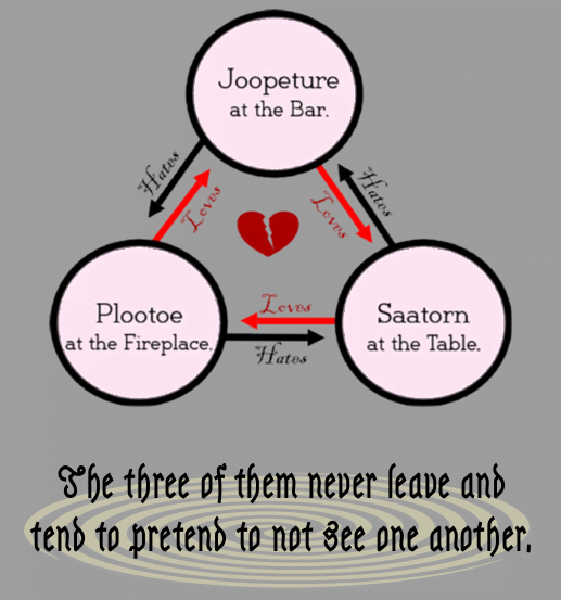 - Ayo Three, ship captain. Obsessed with resolving the Triangle Tavern love triangle. Thinks they should all just make out and get it over with. Lives out in the woods in a tent filled with copious, increasingly angry notes on the lovers.